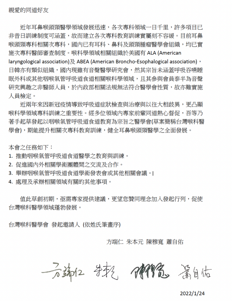 為因應耳鼻喉頭頸醫學發展迅速,各次專科領域一日千里,許多項目已非昔日訓練制度可涵蓋。於新冠疫情期間,呼吸道症狀檢查與治療更與以往大相歧異,益發凸顯喉科學領域專科訓練之重要性。在諸多前輩催促下,「台灣喉科醫學會 」於 2022 年 1 月24日由發起邀請人方端仁、朱本元、陳穆寬及蕭自佑醫師(依姓氏筆畫序)籌備發函,發起人邀請信之內容如下: